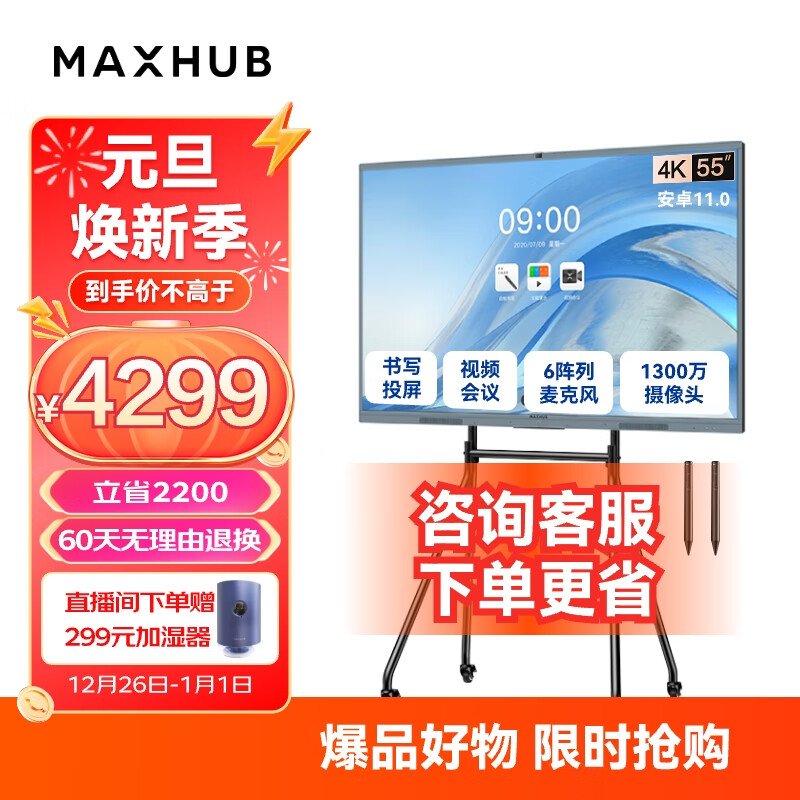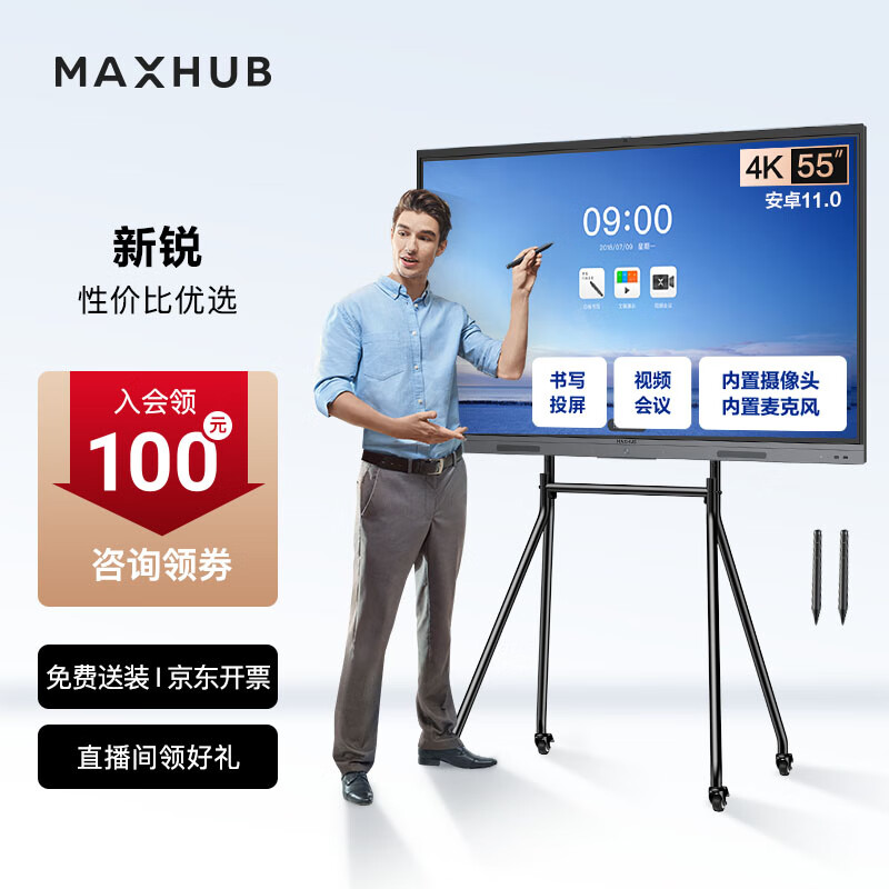 MAXHUB视频会议平板教学一体机触屏书写无线投屏内置会议摄像头麦克风V6新锐E55+时尚支架价格:4299.00元!
