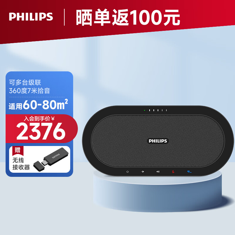 飞利浦PHILIPS 视频会议全向麦克风 无线音箱桌面扬声器 适用80㎡会议室 7米拾音半径麦克风 带电池PSE0501价格:2789.00元!