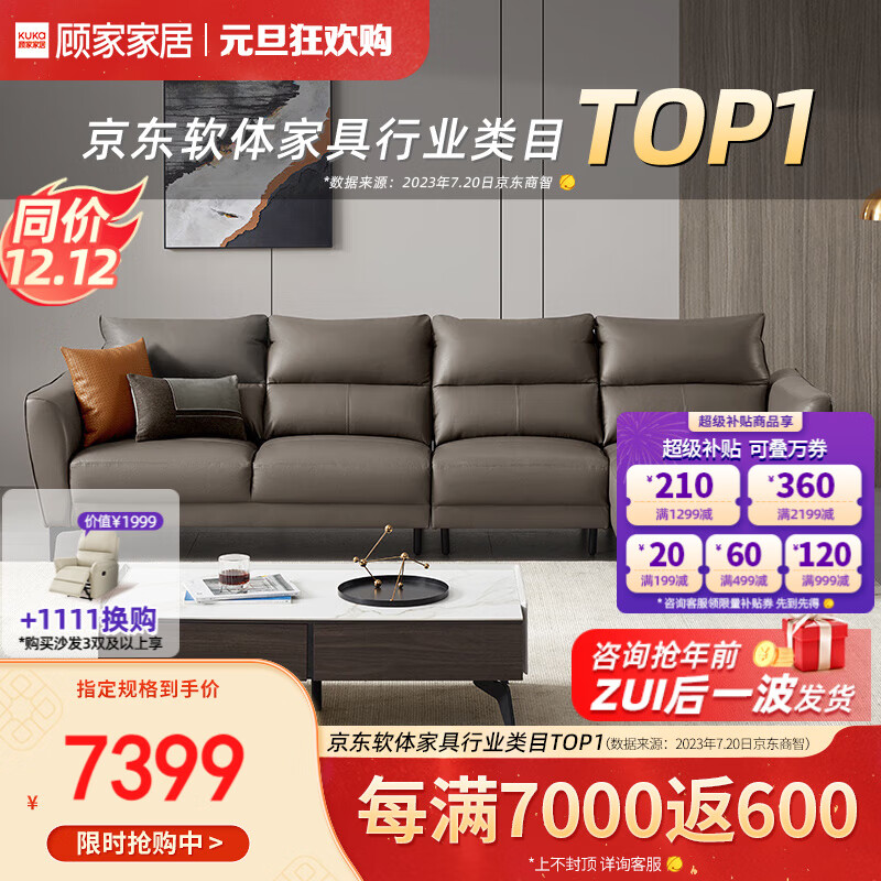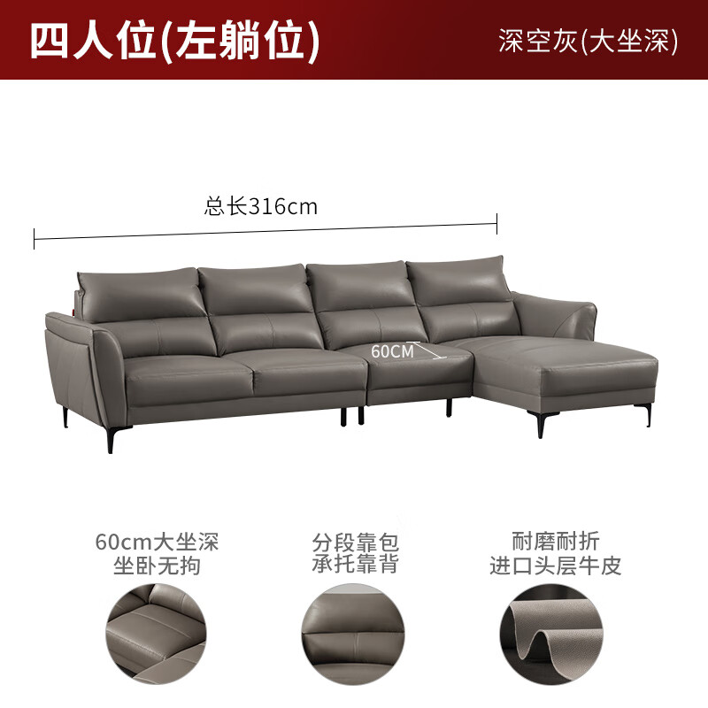 顾家家居(KUKA)皮沙发现代轻奢沙发客厅沙发1107【深空灰】四人位左躺位大坐深价格:7399.00元!