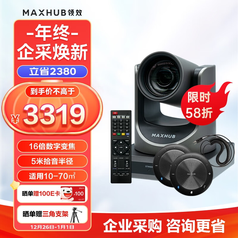 MAXHUB视频会议套装5米拾音半径全向麦克风BM20*2+1080P高清会议摄像头SC61A云台可旋转高清光学变焦价格:3319.00元!