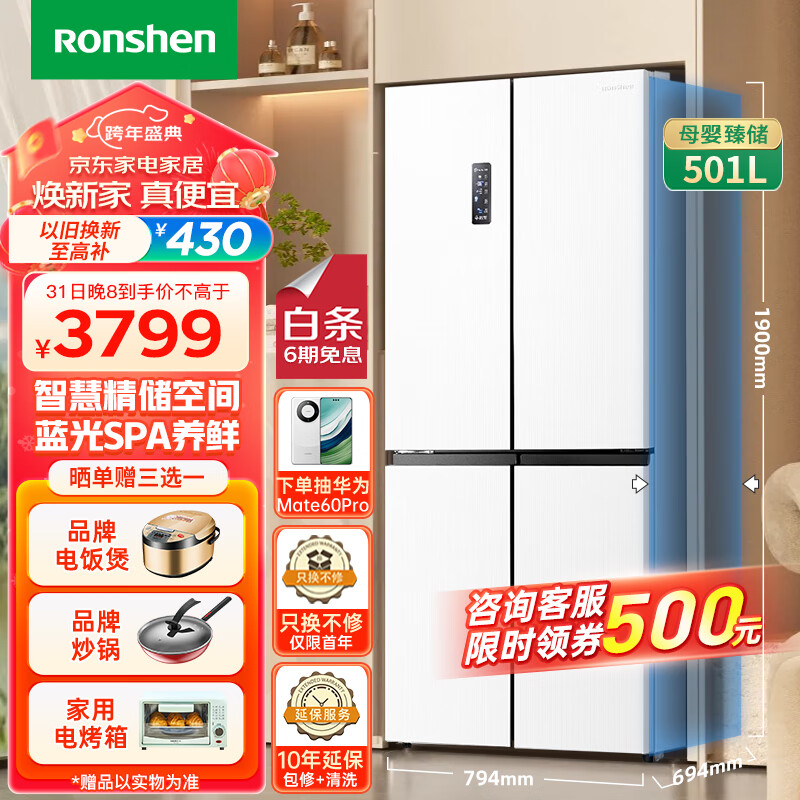 容声(Ronshen)蓝光养鲜501升十字对开四开门冰箱家用无霜变频一级能效BCD-501WD18FP大容量双循环白色价格:4299.00元!