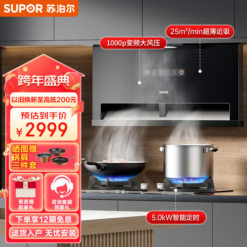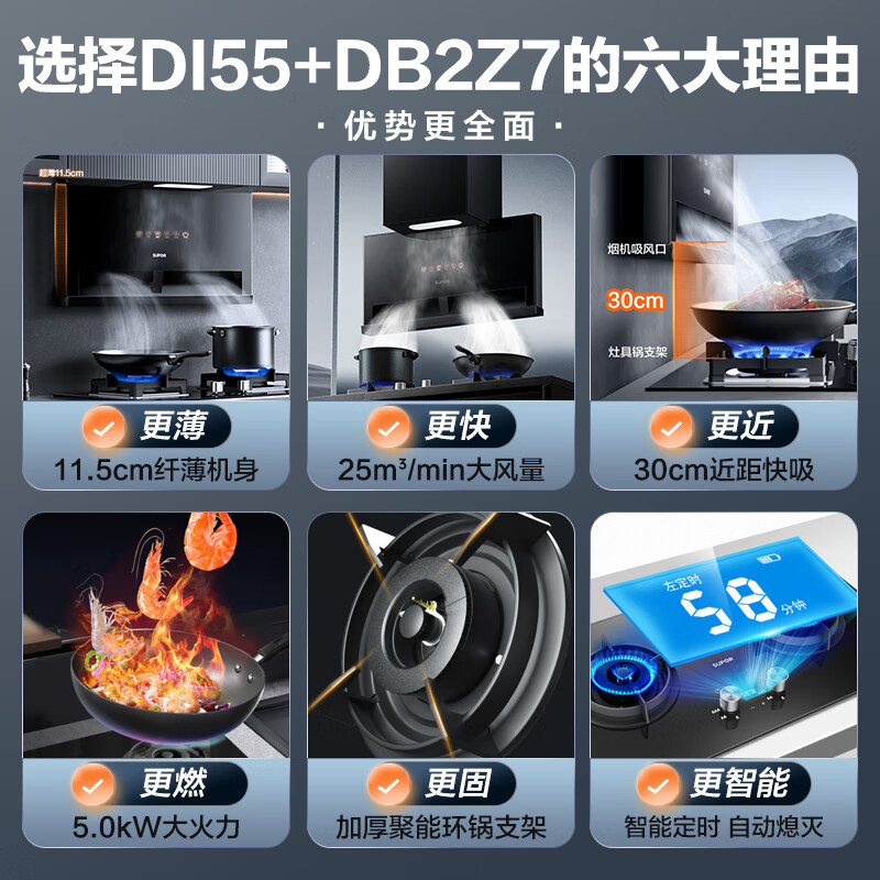 苏泊尔(SUPOR)抽油烟机燃气灶烟灶套装 25立方大吸力超薄低吸1000pa变频挥手智旋干洗DI55+DB2Z7天然气价格:3199.00元!