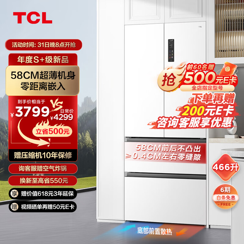 TCL 466升T9法式四开门多门58cm超薄零嵌入式白色风冷家用电冰箱杀菌除味一级能效大容量R466T9-DQ价格:3999.00元!