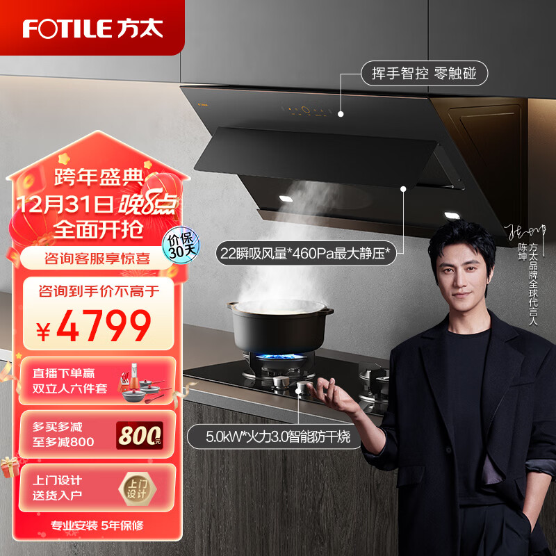 方太(FOTILE)抽吸油烟机灶具套装 侧吸式烟灶套装智能挥手 22大风量防干烧灶家用静音 JCD9A+02-DA21B(天然气)价格:4799.00元!