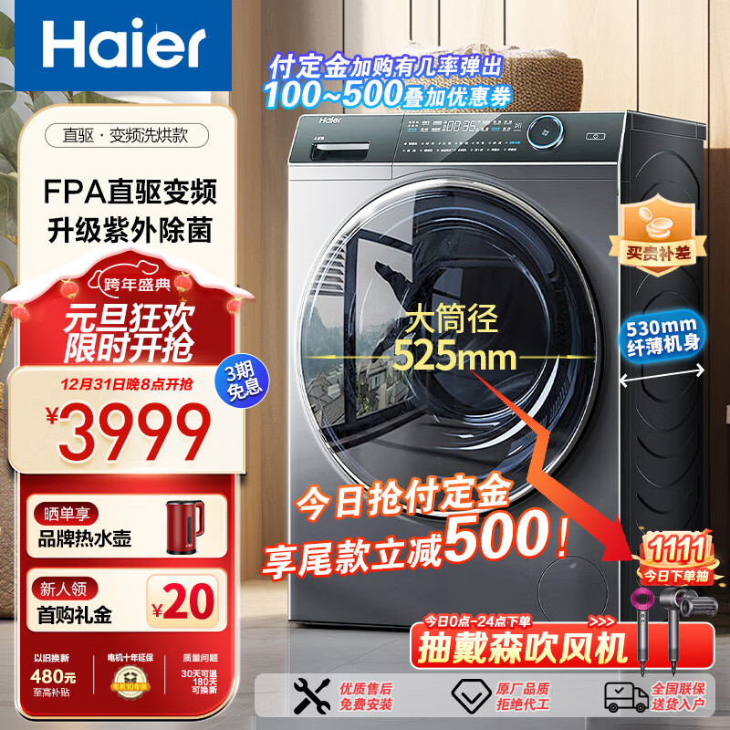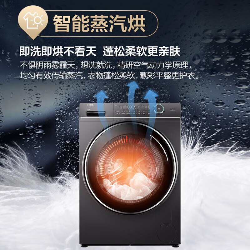 海尔(Haier)滚筒洗衣机 10公斤超薄直驱变频洗衣机洗烘一体 智能投放紫外线除菌 525mm大筒径以旧换新价格:3998.00元!