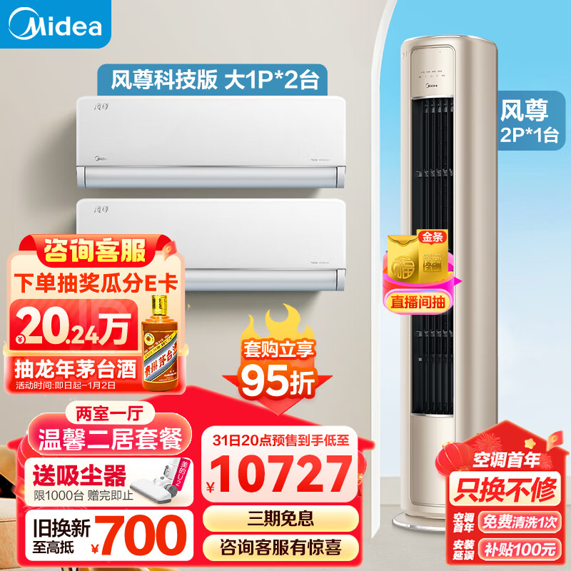 美的(Midea)空调 风尊系列 温馨二居套餐 两室一厅套装(大1匹风尊科技版*2+2匹风尊柜机)一站购齐套购价格:11397.00元!