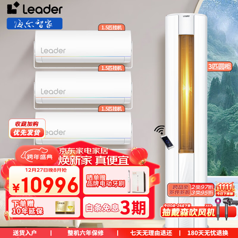 统帅(Leader)空调海尔空调出品新一级能效全直流变频冷暖 APP智控立柜式自清洁智能防直吹适用三室一厅空调套装价格:10996.00元!