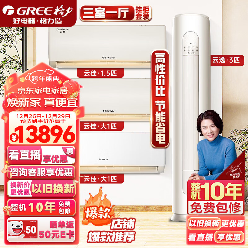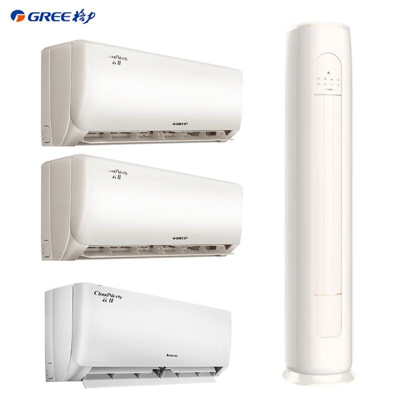 格力(GREE)空调快速冷暖 空调套装(1匹云佳一级挂机+1匹云佳三级挂机+1.5匹云佳三级挂机+3匹云逸三级柜机)价格:13896.00元!