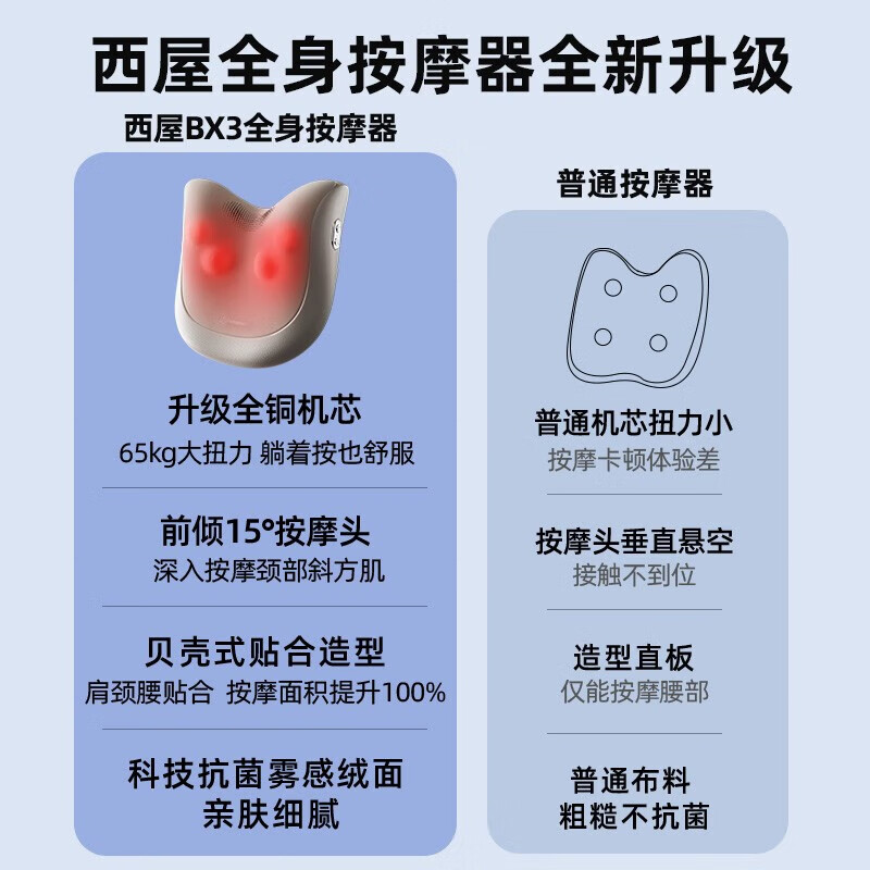 1、颜色好看。力度大小适中,肩颈和腰都能按摩,坐靠在相应位置就行。总体来说,西屋的品质还是不错的。