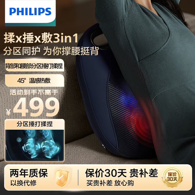 飞利浦(PHILIPS)腰背部按摩器多功能腰椎按摩仪捶打揉捏热敷便携办公按摩垫靠垫靠枕送礼礼品高端礼物5111B价格:499.00元!
