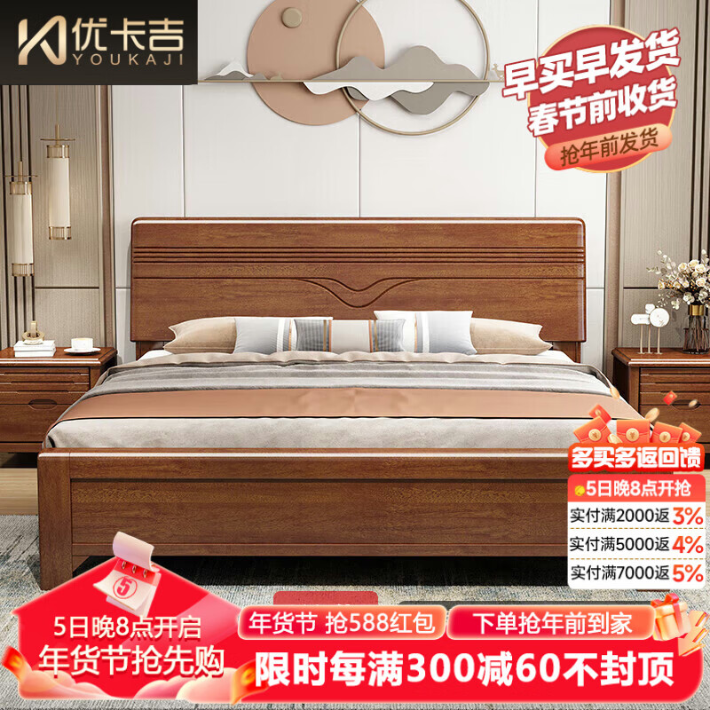 优卡吉胡桃木实木床新中式经济1.5/1.8储物668# 1.5米箱框床+床垫+柜*2价格:3119.00元!