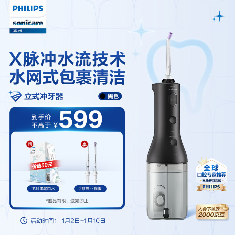 飞利浦家用立式冲牙器男/女立式手持2种洁齿模式3级洁齿力度美牙舱 HX3806/33黑色送礼 新年礼物价格:679.00元!