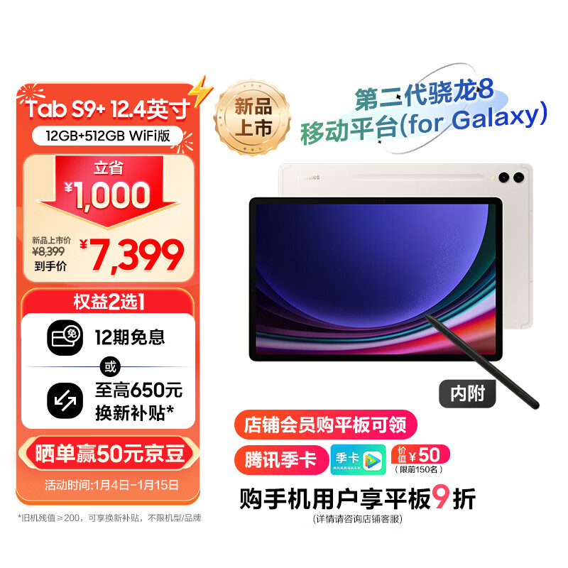 三星(SAMSUNG)平板电脑2023款Tab S9+ 12.4英寸 12G+512G WIFI 骁龙8Gen2 顺滑全视屏 内附Spen 云雾金价格:7399.00元!