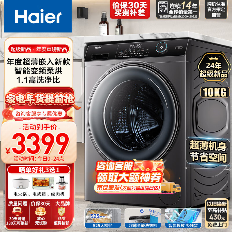 海尔(Haier)全自动滚筒洗衣机 智能投放 10公斤洗烘一体变频超薄嵌入式1.1洗净比大桶径空气洗 以旧换新 309LS价格:3399.00元!