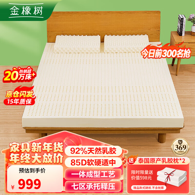 金橡树泰国乳胶原液进口床垫加厚双人床垫 1.5米*2米 厚7.5CM 泰舒价格:999.00元!