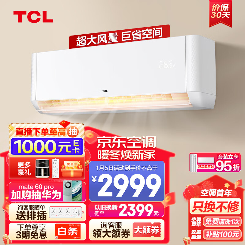 TCL空调 2匹 新三级能效 变频冷暖 净怡风 大风量 壁挂式卧室空调挂机 KFR-51GW/JQ2Ea+B3以旧换新价格:2999.00元!