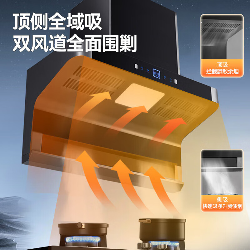 4、抽烟烟机顶侧双侧,吸力大,颜值高,换掉旧机,瞬间美观又大方了