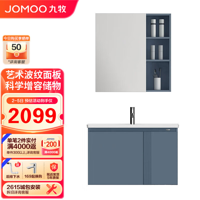 九牧(JOMOO)浴室柜陶瓷一体盆极简奶油风洗脸盆柜组合灰蓝80cm A2718-148W-1价格:2499.00元!