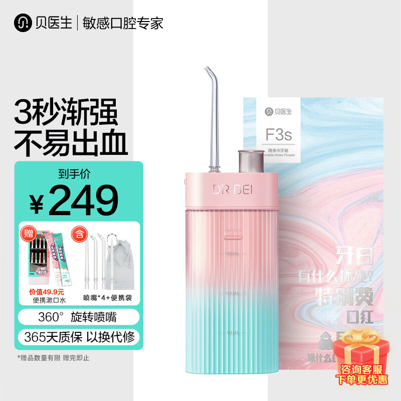 贝医生(DR·BEI) 冲牙器便携家用洗牙器洁牙器水牙线清洁口腔牙套清洗牙石礼物送女友 国货 清洁亮白护龈圣诞礼物 女神优选NEW·樱雪晴空F3s【内配4喷嘴】价格:499.00元!