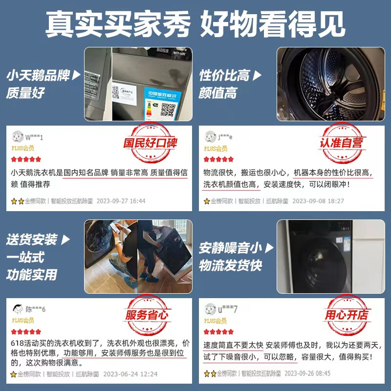 3、小天鹅洗衣机老牌子了,原来的三星滚筒洗衣机用了6年退役没有维修价值,直接换新吧...千挑万选挑了这台,感觉挺不错的,到货之后直接安装好就可以用了!除了水流和衣物拍打的声音,机械声音比较安静。国产质量还是过硬的,细节方面需要再提升。虽然价格不贵,但品质一定不能马虎。后续等使用一段时间再评价
