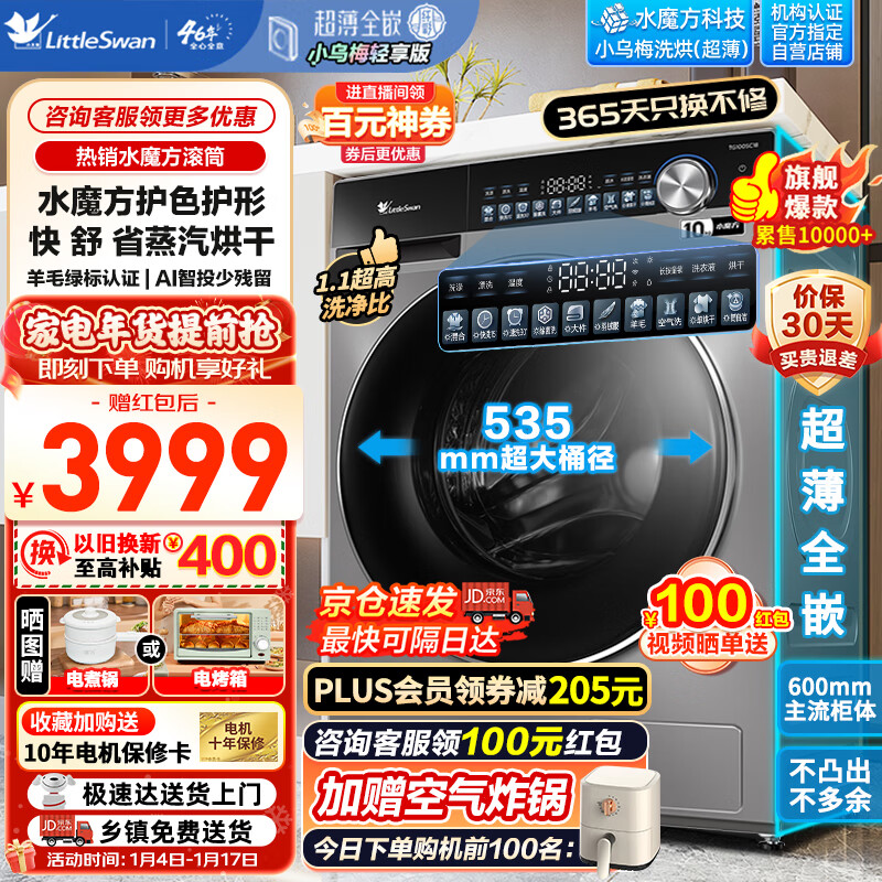 小天鹅(LittleSwan)洗衣机全自动家用洗烘一体10公斤滚筒水魔方小乌梅轻享版超薄全嵌智能投放大筒径SC18价格:3999.00元!