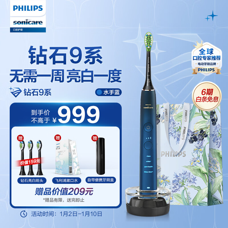 飞利浦(PHILIPS)电动牙刷成人情侣款 新年礼物 送女友/男友新婚礼物送新人 声波震动 1支刷头 钻石9系 水手蓝价格:1099.00元!