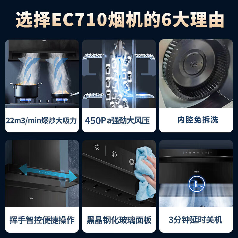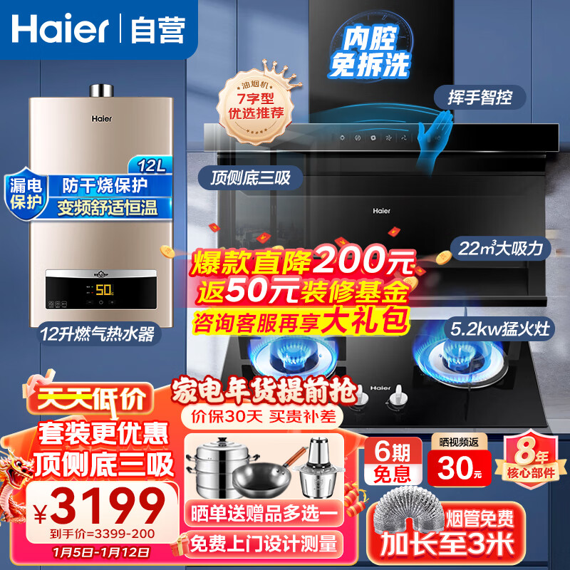 海尔(Haier)抽油烟机灶具套装22立方挥手智控顶侧双吸EC710+5.2KW猛火燃气灶BE50+12升燃气热水器 厨房三件套价格:3199.00元!