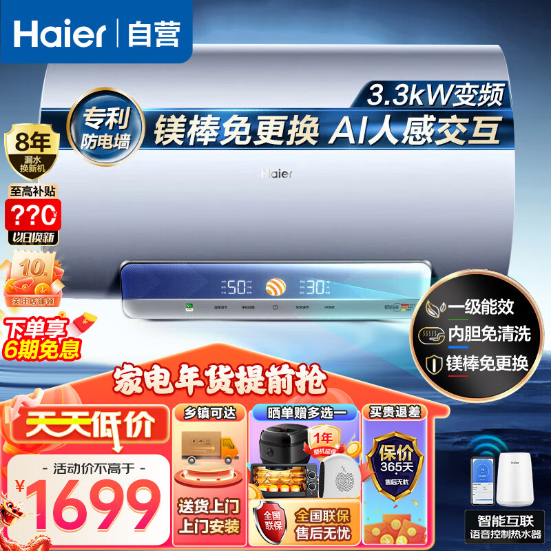 海尔(Haier)60升热水器电热水器家用变频速热储水式一级能效内胆免清洗镁棒免更换WiFi智控Fresh7价格:1699.00元!