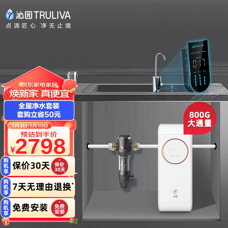 沁园(TRULIVA)小白鲸Pro800G二件套装 净水器UR-S5876i+前置过滤器P-A5510 全屋净水套装价格:2798.00元!