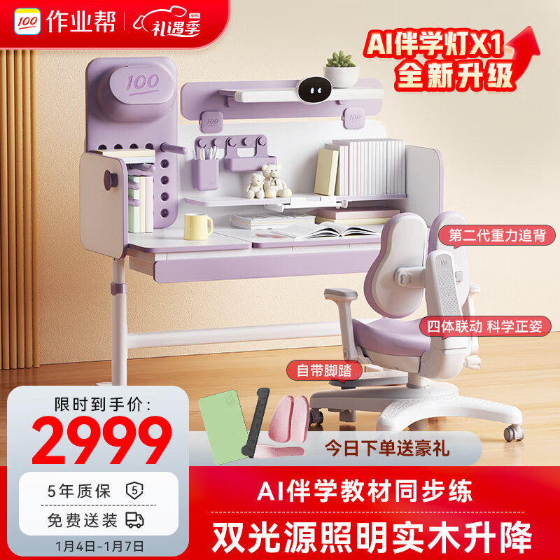 作业帮辅导家AI伴学灯X1升级 儿童学习桌椅追背椅pro实木书桌1.2m紫黛粉价格:2999.00元!
