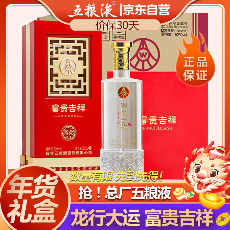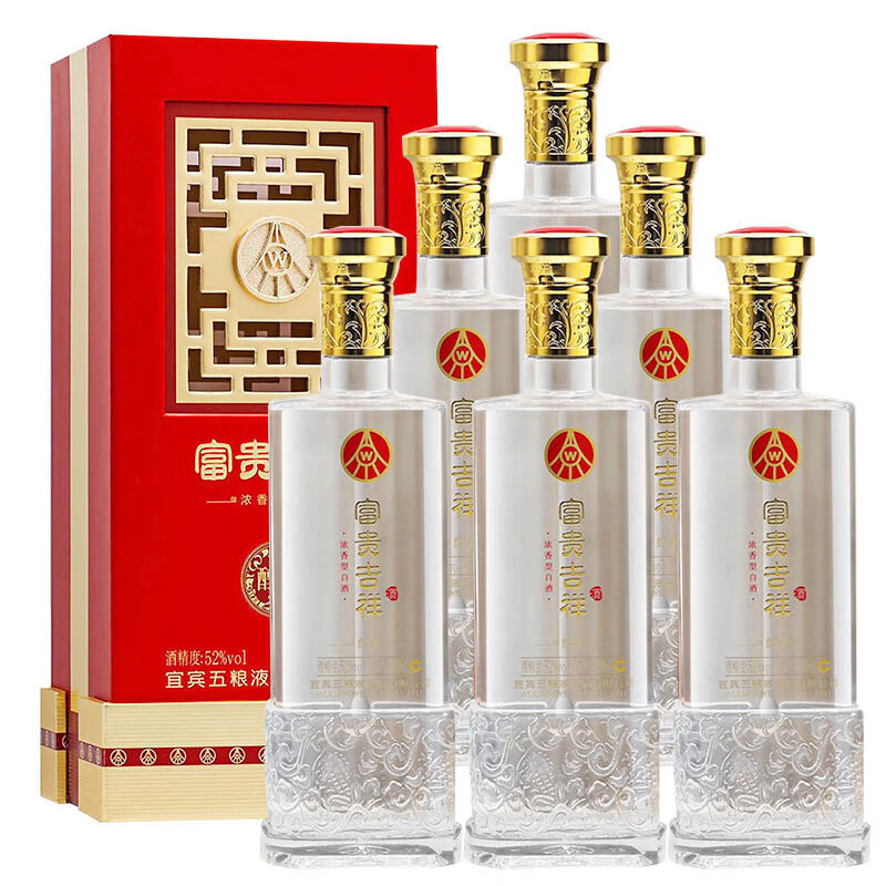 五粮液富贵吉祥醇柔浓香型白酒礼盒整箱6瓶52度500ml龙年货节日送礼酒水价格:1059.00元!