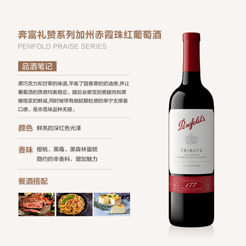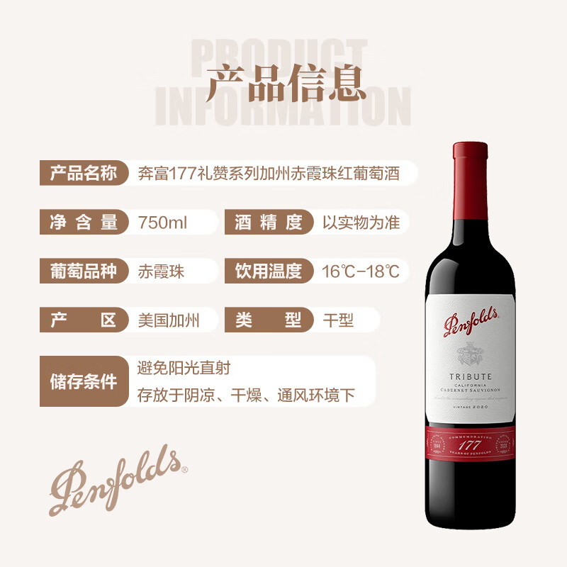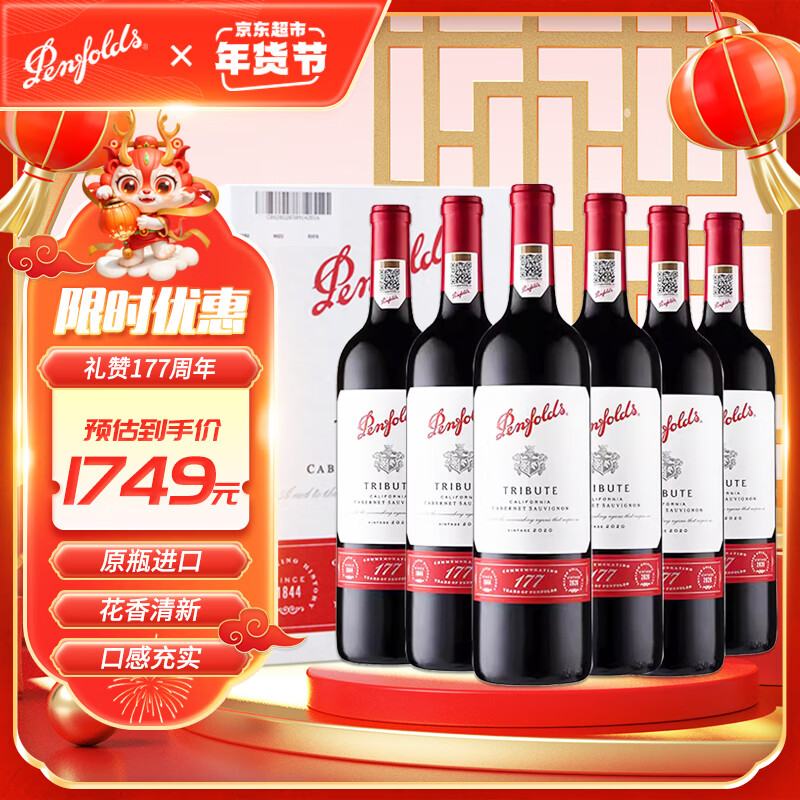 奔富(Penfolds)礼赞系列177周年限量款加州赤霞珠红葡萄酒 750ml*6 整箱装价格:1749.00元!