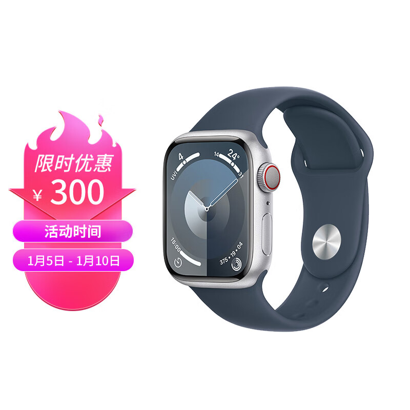 Apple Watch Series 9 智能手表41毫米银色铝金属表壳风暴蓝色运动型表带M/L 电话手表【蜂窝款】iWatch s9价格:3499.00元!
