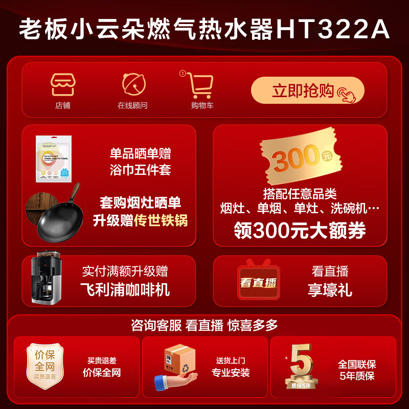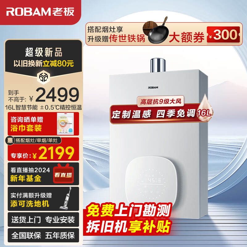 老板(Robam)小云朵16升燃气热水器天然气匀氧稳燃小尺寸智能恒温降噪高层抗风防冻家用强排式JSQ31-HT322A-16价格:2499.00元!