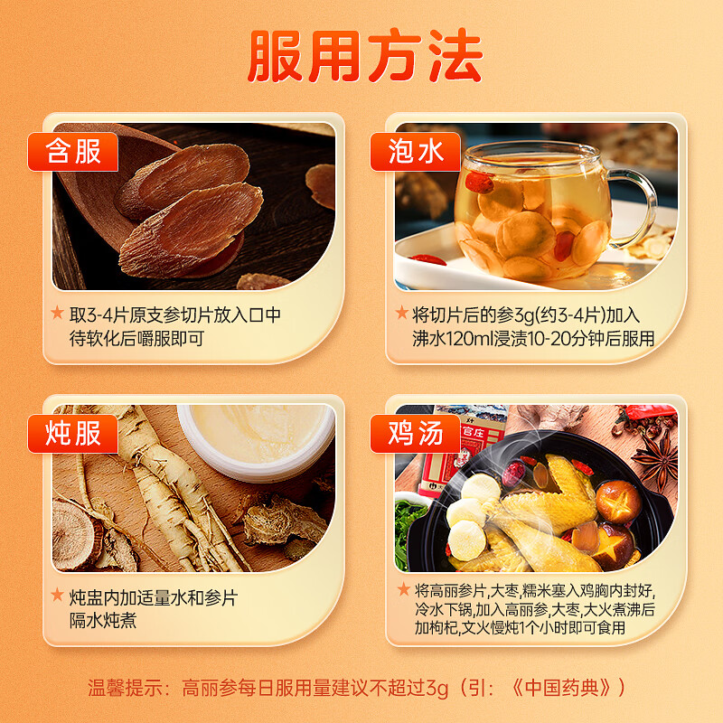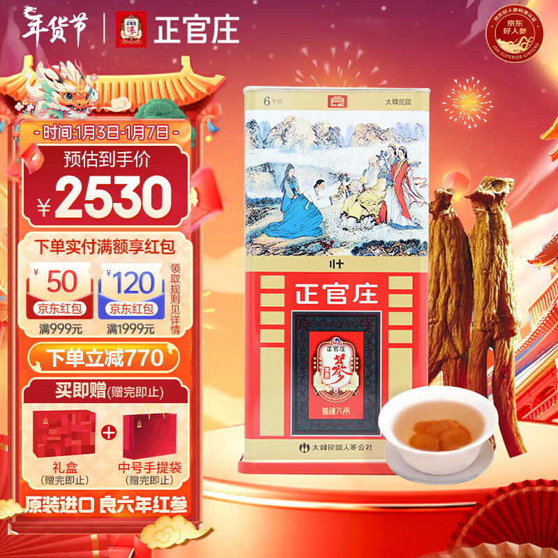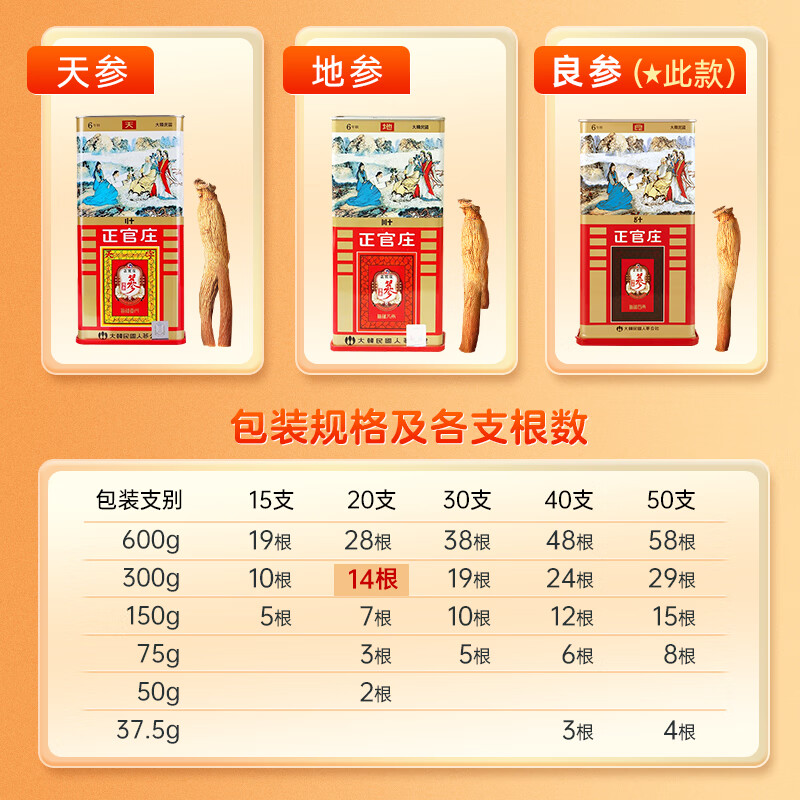 正官庄 人参 韩国原装进口 六年根高丽参 红参 [良字]20支300g礼盒(约14根参)皂苷年货春节健康滋补礼物价格:3300.00元!
