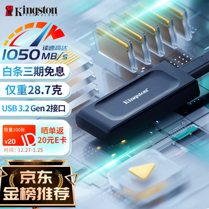 金士顿(Kingston)1TB USB3.2 Gen 2 移动固态硬盘(PSSD)XS1000 传输速度1050MB/s 轻巧时尚价格:619.00元!