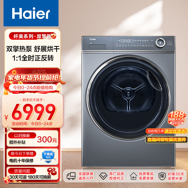 海尔(Haier)纤美176烘干机家用 10公斤双擎热泵干衣机 一件智烘 羊毛烘 空净过滤 EHGS100176XSU1以旧换新价格:6999.00元!