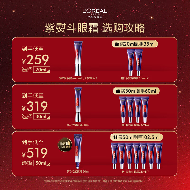 欧莱雅紫熨斗眼霜2.0 50ml 按摩头玻色因淡纹提亮眼部护肤品新年礼物女价格:519.00元!