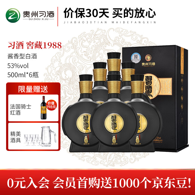 习酒贵州习酒 酱香型白酒 纯粮固态发酵 过年送礼 53度 500mL 6瓶 窖藏1988 原箱价格:4108.00元!