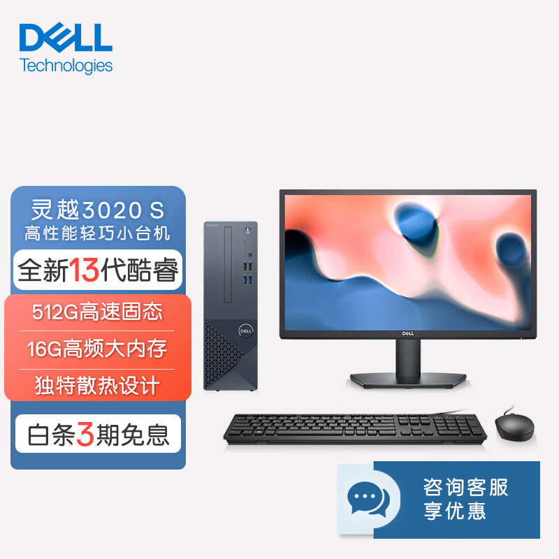 戴尔(Dell)灵越3020S 新款 台式电脑主机 高性能整机 台式机 商用办公电脑 教育学习 图形设计 (13代i7-13700 16G 512GSSD三年上门)21.5英寸显示器价格:5649.00元!
