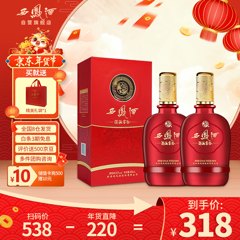 西凤酒 龙凤呈祥52度陕西纯粮食凤香型白酒海窖龄年货送礼盒装500mL*2价格:318.00元!