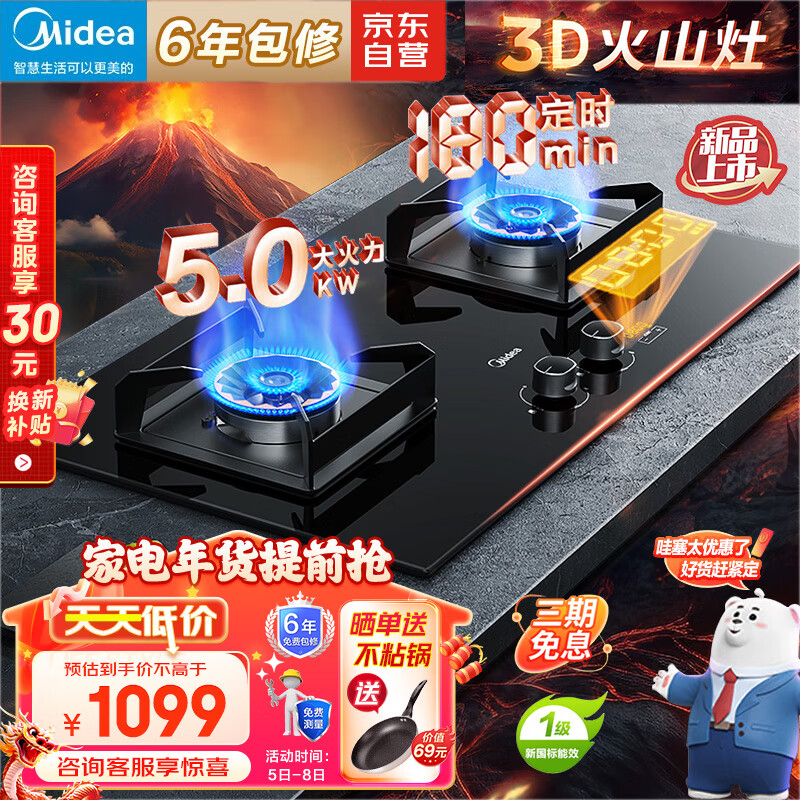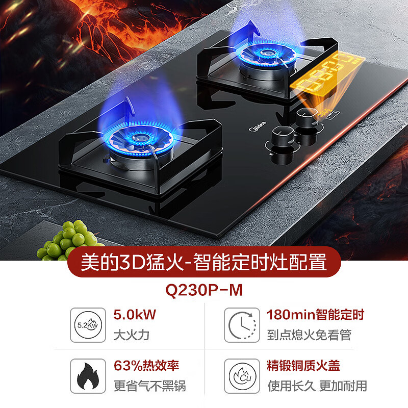 美的(Midea)燃气灶天然气 煤气灶双灶 铜火盖 智能定时灶 5.0kW大火力灶具 家用台嵌两用180min定时 Q230P价格:1099.00元!