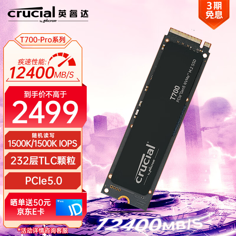 英睿达(Crucial)美光 2TB SSD固态硬盘 M.2接口(NVMe协议)四通道PCIe5.0 读速12400MB/s Pro系列T700价格:2499.00元!