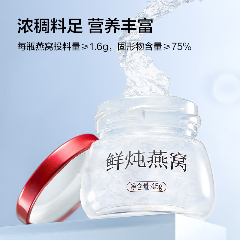 1、买了好几次了,女儿很喜欢吃。打开和使用都很方便,包装很精致。每天一瓶,价格实惠。包装很有档次,燕窝口感很好,很满意的购物。