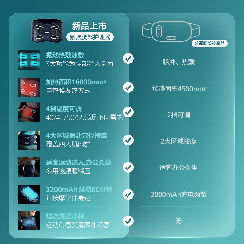 2、双十一看到有活动,果断入手,想买这个的原因是看到他有热敷和冷敷,平时去健身房带着用,比较满意加热很快,面积也大,整个腰部都很舒服,冬天来了开车,办公室,都能用,带着也很方便!