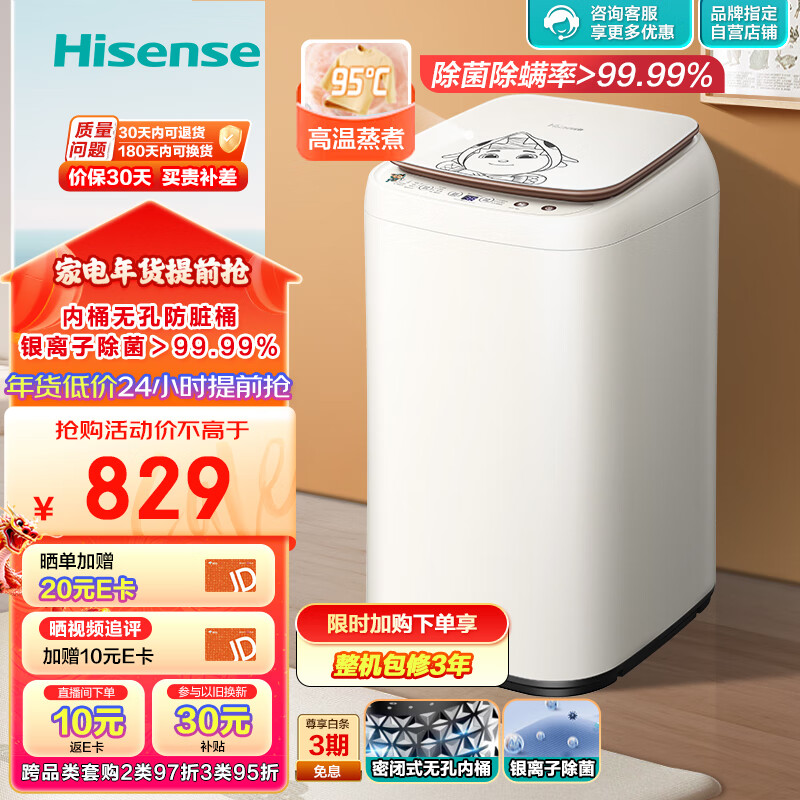 海信(Hisense)小哈利波轮洗衣机全自动 3公斤迷你洗衣机小 儿童婴儿洗衣机 无孔内桶高温煮洗HB30DF645M以旧换新价格:829.00元!