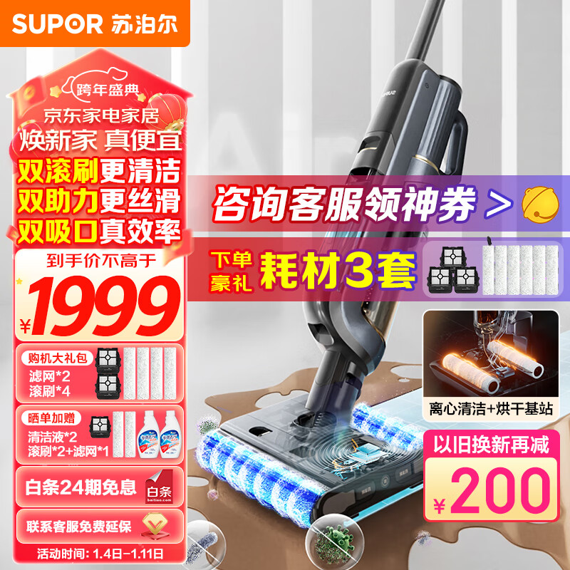 苏泊尔(SUPOR)双滚刷家用洗地机洗拖一体全自动手持电动拖地机无线自清洁烘干擦地吸水式吸尘器洗地机 EWV-D06价格:2799.00元!