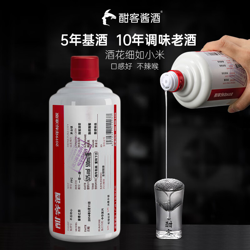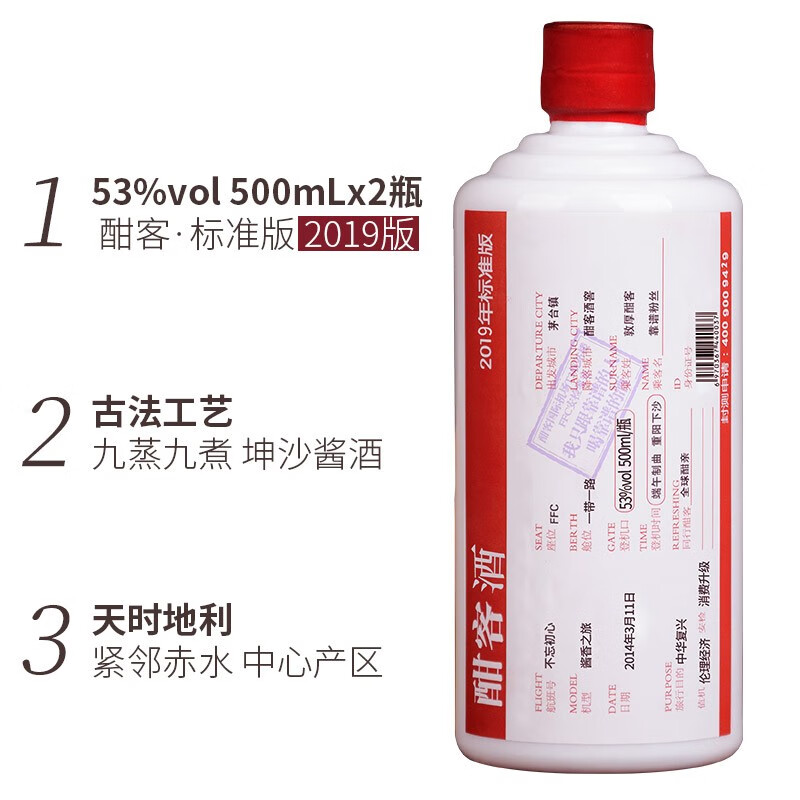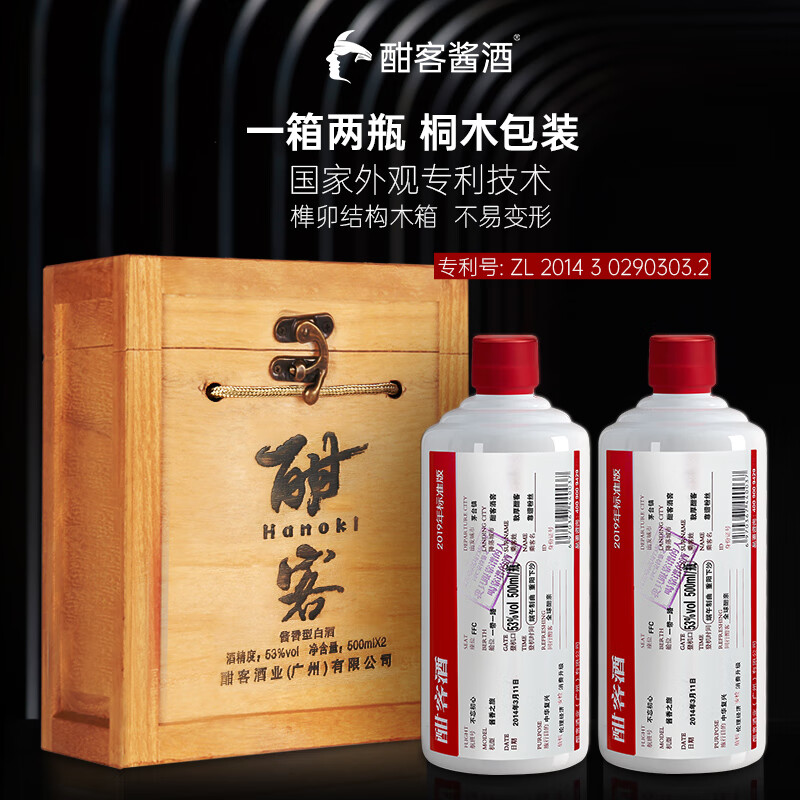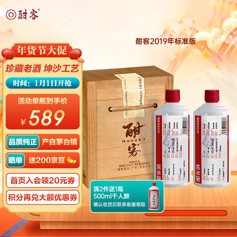 酣客 2019标准版 酱香型白酒53度坤沙大曲 500ml*2瓶 木箱礼盒装价格:1178.00元!