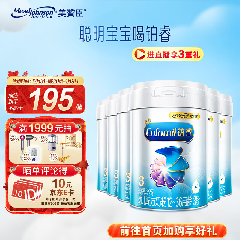 美赞臣铂睿 A2奶粉3段 幼儿配方奶粉(12-36月)850克*6整箱装 实证DHA价格:1211.00元!