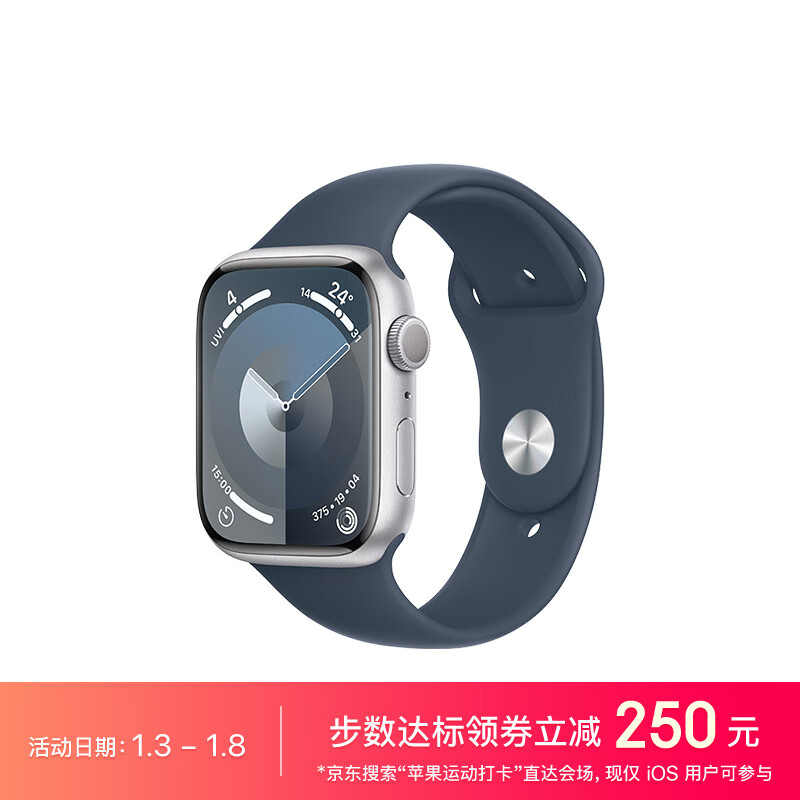 Apple Watch Series 9 智能手表GPS款45毫米银色铝金属表壳 风暴蓝色运动型表带S/M 健康手表S9 MR9D3CH/A价格:3199.00元!